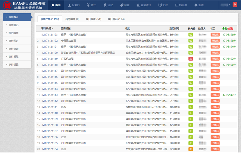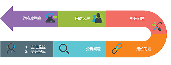 2.完备的运维服务体系,由主动发现问题或接报障、分析、定位、处理、回访、满意度调查每一个过程紧密结合,环环相扣。
